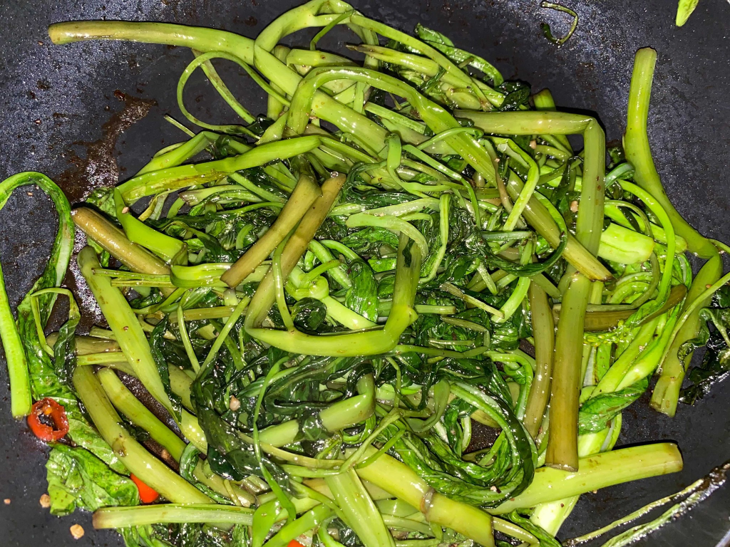 Thôi vô mần gì ăn cho rồi, bữa nay quyết chơi sang và khoe khoang luôn, chảo rau xào dầu ớt ứ hự.